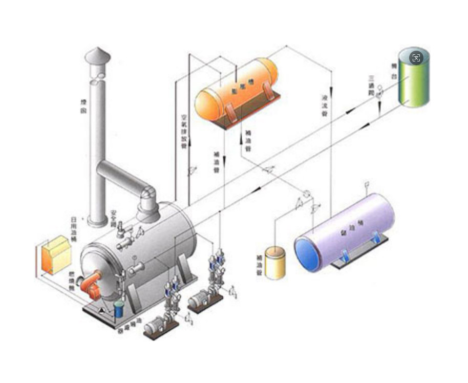主要由循環油泵、加熱爐本體、熱用戶(用熱設備)、油氣分離器及相關閥門管線構成,如儲油槽、膨脹槽、注油泵等也都是不可缺少的輔助管路及設備。