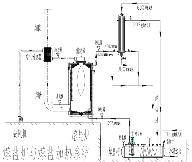 熔鹽在濃縮器釋放熱量后降溫至約400℃,回流至熔鹽槽,再由熔鹽泵送回加熱爐重新升溫,形成閉路循環系統 。利用氫氣燃燒供熱,可精準控制熔鹽出口溫度,保障工藝穩定性。